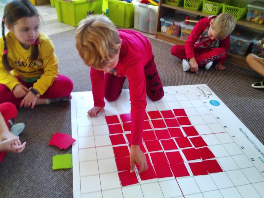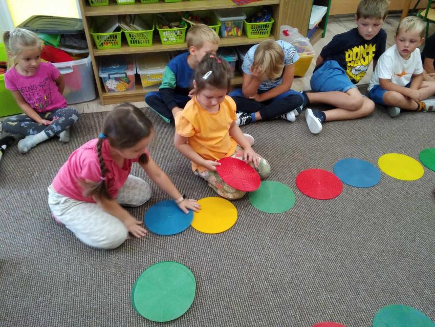 W grupie Odkrywcy bawimy się z figurą geometryczną koło, układamy wg zauważonego rytmu i wykonujemy sygnalizator świetlny.