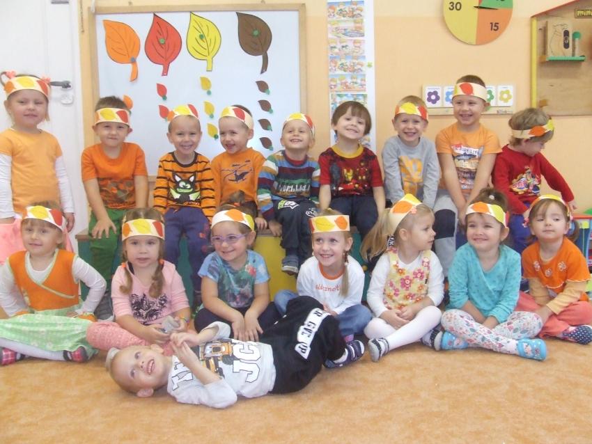 We wrześniu dzieci z naszego przedszkola witały jesień. Dzieci w tym dniu ubrane były na pomarańczowo.